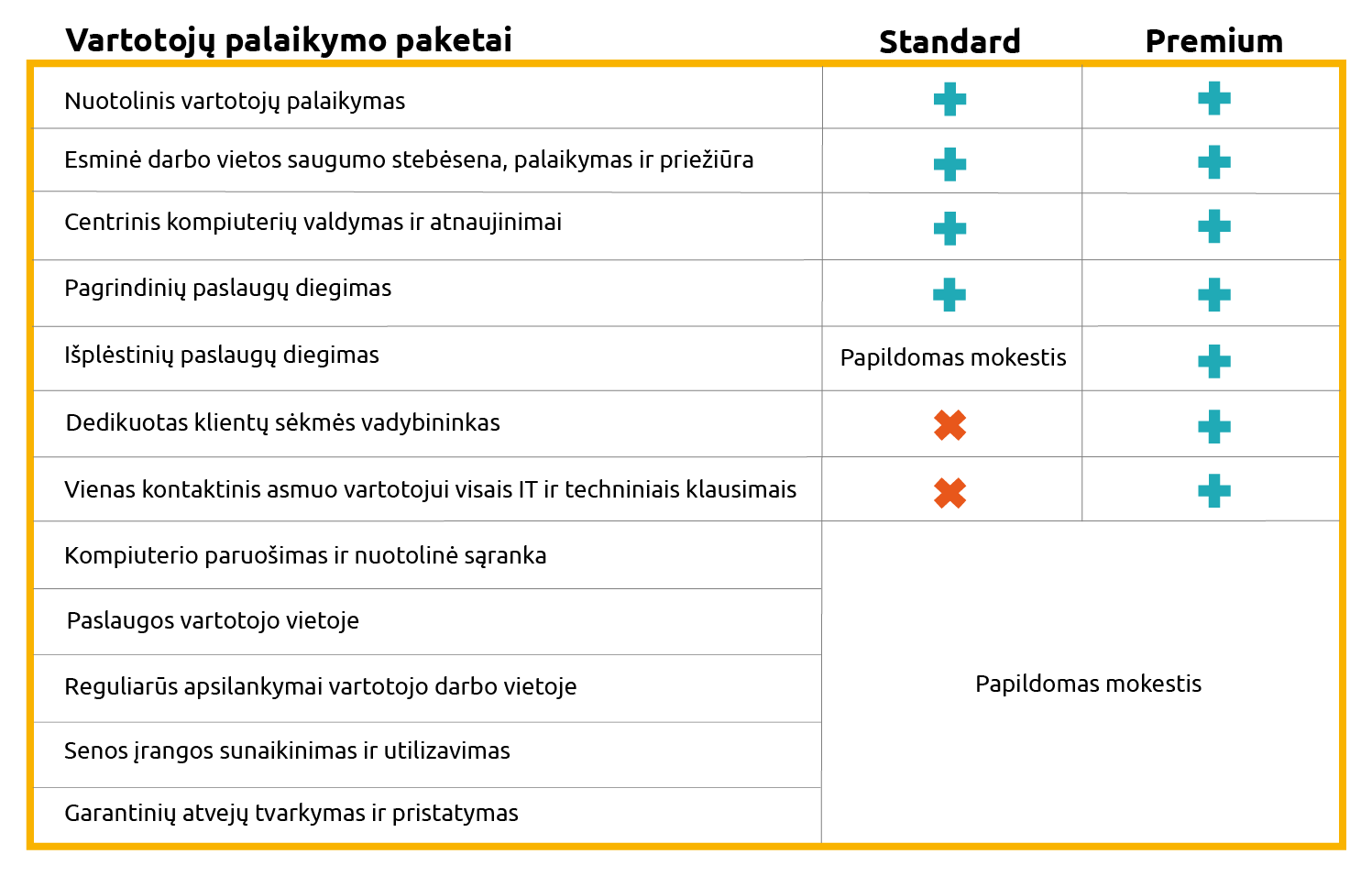 - IT saugumas ir plėtra – premium paketas užtikrina aukštesnį saugumo lygį, reguliarius saugumo patobulinimus, rekomendacijas IT strategijos ir biudžeto planavimui bei efektyvesnį licencijų panaudojimą.