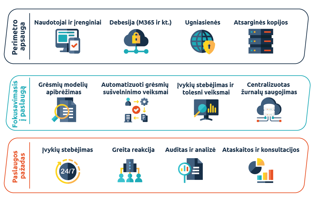 - akimirksniu aptinka anomalijas: neįprastus prisijungimus, failų kopijavimą, įtartinų paskyrų kūrimą, sukčiavimo (phishing) ar išpirkos reikalaujančių virusų (ransomware) atakas;